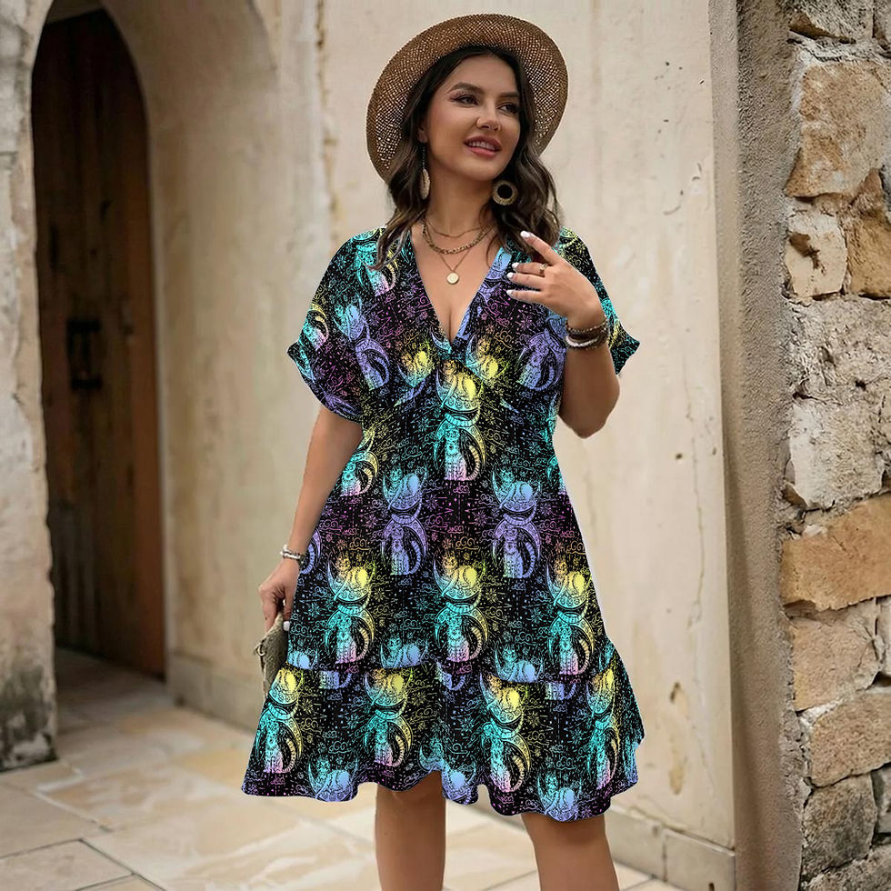 Celestial Cats Boho Flowy V-Neck Short Sleeve Dress