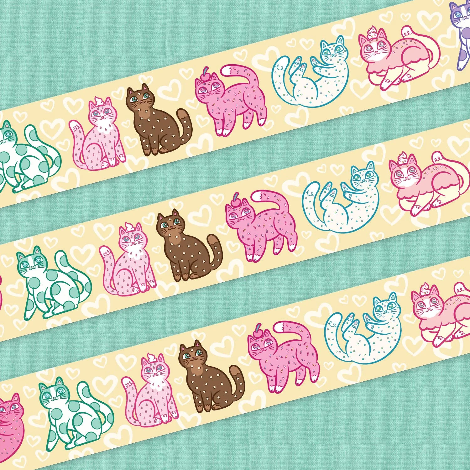 Sweet Kitties Desserts Washi Tape. It's time to decorate everything with cats! Pink Owlet washi tape designs are unique to our shop. These washi tapes are all designed by me especially for all of you cat lovers out there. They make great gifts for you or your cat loving friends. Great for scrapbooks, cards, and journals! Also great for artwork and collages. It adds the extra cuteness to your packages, gift boxes, and more!